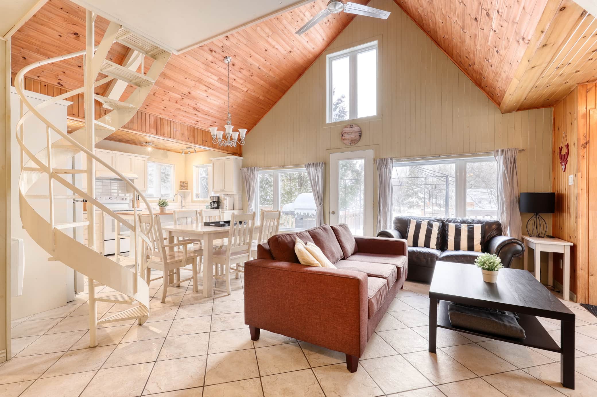Coin feu sur le bord du lac, spa, poêle à combustion lente, grande cuisine et espace ouvert pour une ambiance conviviale.